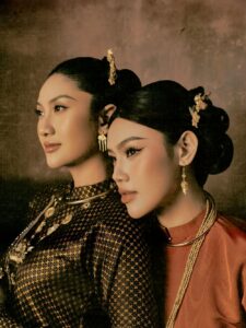 Xuôi về phương Nam, Hoa hậu Phương Linh và Á hậu Cẩm Ly thể hiện hình ảnh người phụ nữ xưa với tinh thần cởi mở và giàu sức sống. Tóc búi bánh lái, trang phục kết hợp cùng phụ kiện thủ công kim hoàn tạo nên diện mạo gần gũi nhưng vẫn nổi bật, gợi mở những nét văn hóa riêng của vùng đất phương Nam trong dòng chảy chung của bản sắc Việt.