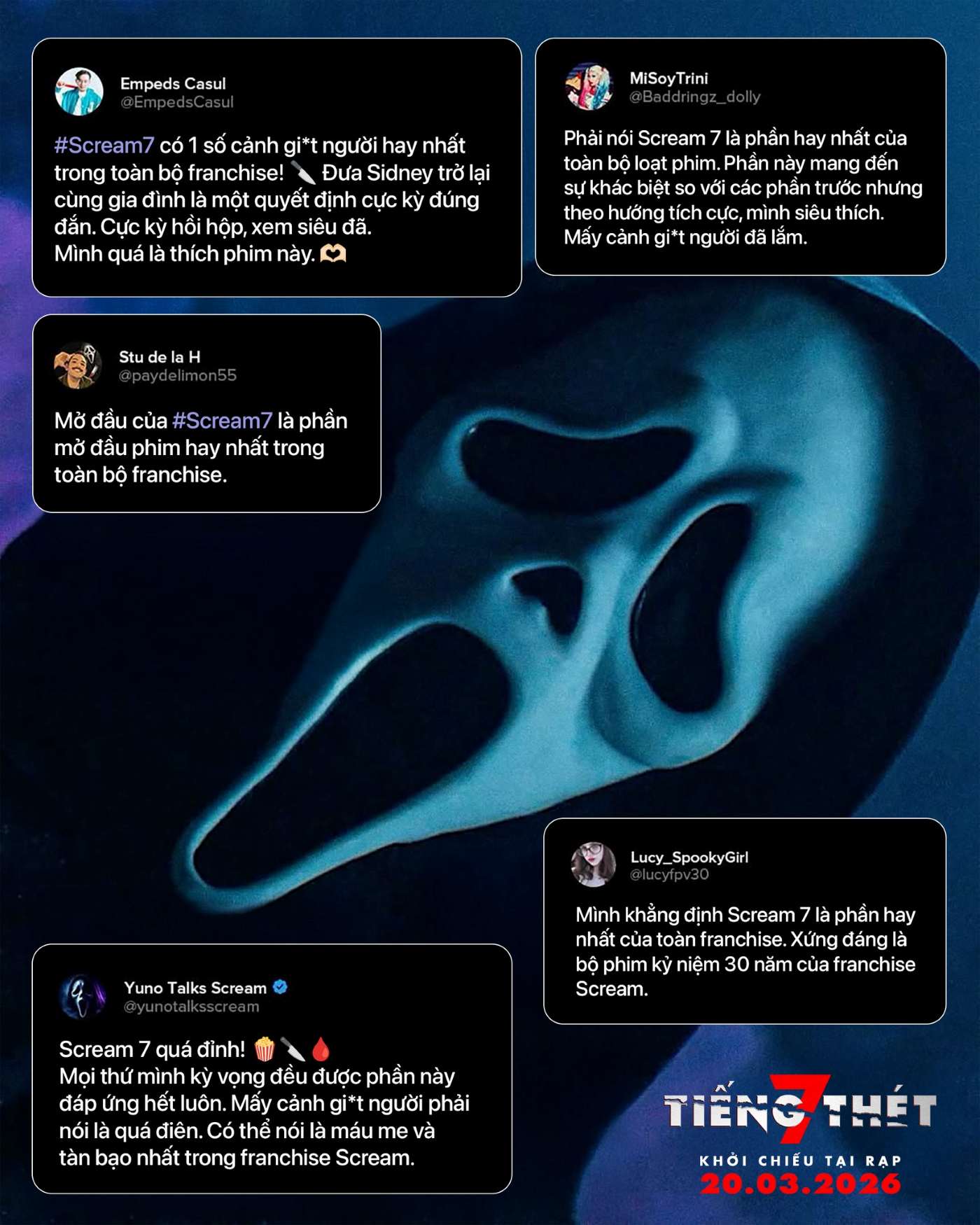 Trên Rotten Tomatoes, TIẾNG THÉT 7 đạt điểm “tươi” 77% từ khán giả, cho thấy mức độ yêu thích chưa từng “hạ nhiệt” của công chúng dành cho chuỗi phim dài hơi này. Đặc biệt, năm 2026 đánh dấu lần đầu tiên sau 30 năm, phim được chiếu tại rạp Việt Nam, mang hành trình của Ghostface ra mắt khán giả. Với nhiều lời khen ngợi và đánh giá cao, dự án hứa hẹn sẽ có hành trình chinh phục doanh thu “không phải dạng vừa” trong tháng 3 này.