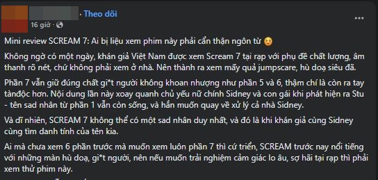 Sau gần 30 năm kể từ phần đầu tiên ra mắt năm 1996, thương hiệu kinh dị Tiếng Thét (Scream) vẫn giữ được sức hút đặc biệt với khán giả toàn cầu. TIẾNG THÉT 7 đánh dấu sự trở lại đầy ấn tượng của biểu tượng Sidney Prescott (Neve Campbell) cùng dàn diễn viên cũ lẫn mới, mang đến cho khán giả hàng loạt những pha rượt đuổi nghẹt thở. Là phần đầu tiên trong series vượt qua kiểm duyệt tại Việt Nam, TIẾNG THÉT 7 nhận về nhiều đánh giá tích cực, thậm chí được khen có yếu tố độc đáo, hay nhất của franchise từ trước đến nay.